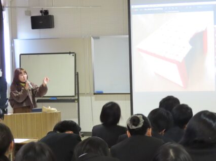 デザイン科では、1期生の中村あかりさんのお話を伺いました。中村さんは現在、美作市の保育園に勤務されており、自身の学生時代の話や卒業制作や、デザイン科で学んだことを現在の仕事にどのように活かしているかなど、具体的にお話ししてくださいました。先輩の等身大のアドバイスに対し、熱心に耳を傾けていました。自分の将来の可能性を広げるヒントを受け取っていたようです。
