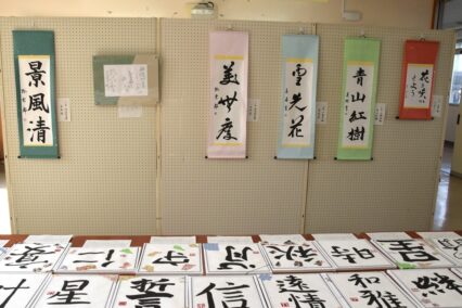 ・日々の練習の成果として、書道展への作品応募や文化の部での展示も行っています。